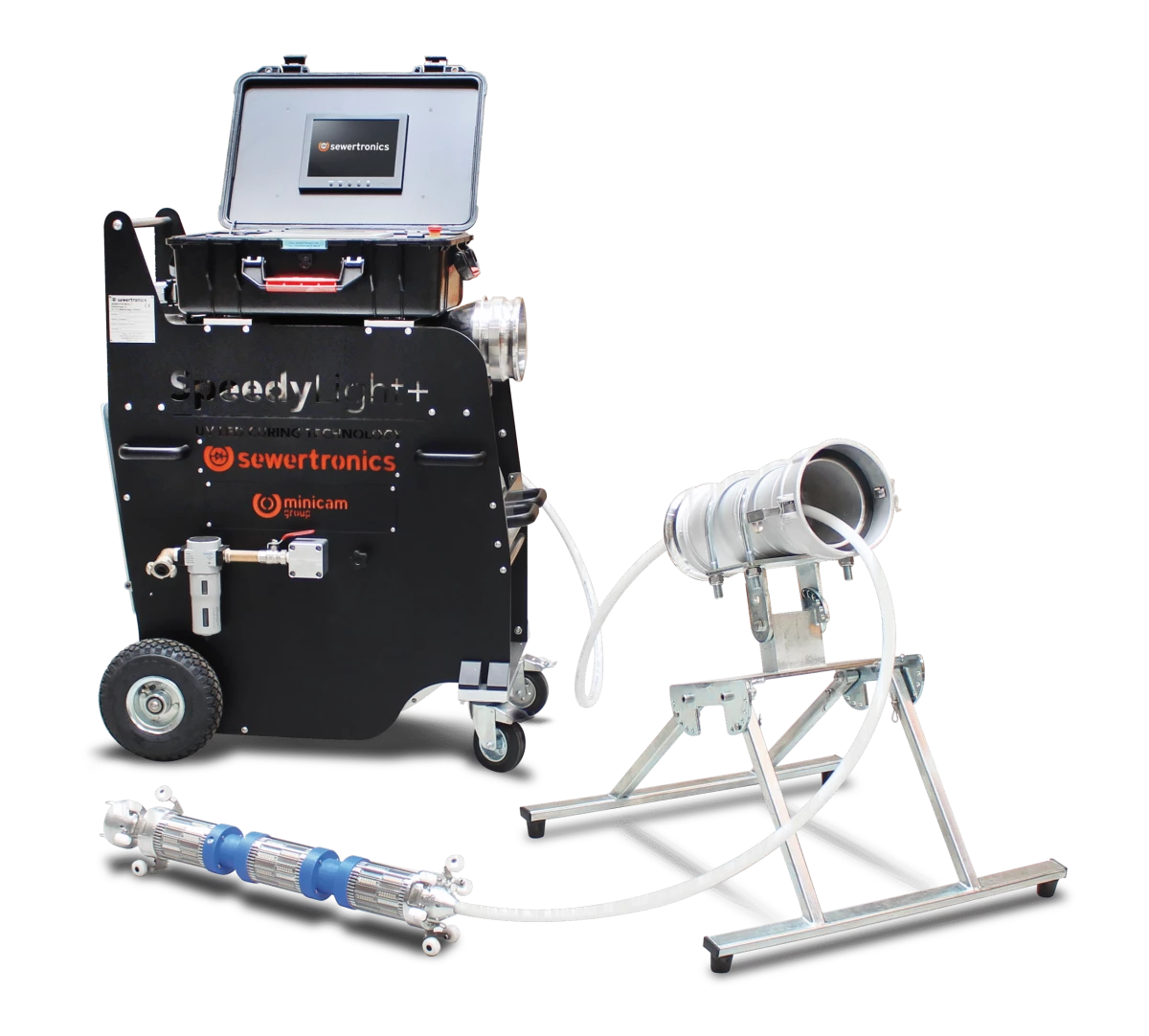 Le SpeedyLight+ est compatible avec une large gamme de diamètres de conduites, allant de DN70 à DN600, ce qui lui confère une grande polyvalence. De plus, il est équipé d'une caméra CCTV intégrée pour une surveillance en temps réel, garantissant une qualité optimale des travaux. En somme, le SpeedyLight+ de SEWERTRONICS® est un choix idéal pour une réhabilitation rapide, efficace et écologique des réseaux d'assainissement.