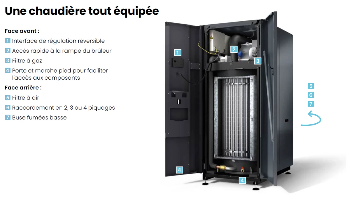La configuration hydraulique est un point clé du produit : la VARMAX 2 est disponible en versions avec 2, 3 ou 4 piquages. Cette modularité de raccordement facilite l’intégration dans différentes architectures hydrauliques et permet d’adapter la centrale de chauffe aux contraintes de distribution (circuits multiples, besoins de raccordement distincts, ou organisation spécifique de la chaufferie). En pratique, ces variantes de piquages sont utiles pour simplifier le montage, réduire la complexité de tuyauterie et répondre à des schémas d’installation variés, tout en conservant les avantages d’une chaudière gaz à condensation.