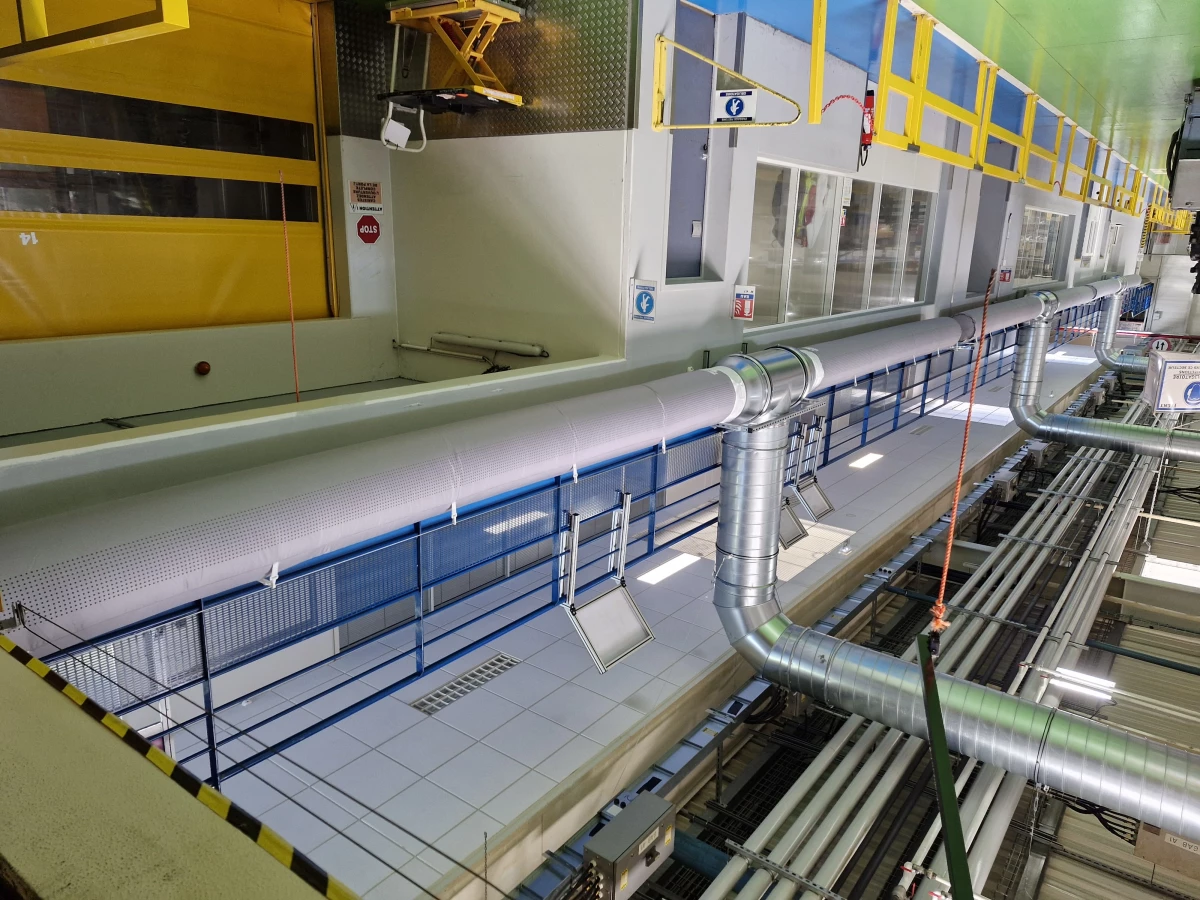 Diffusion par Gaine Textile : Pour la réintroduction de l'air, nous avons privilégié des gaines textiles. Leur avantage ? Une diffusion homogène, douce et sans courants d'air, transformant radicalement le confort en atelier.