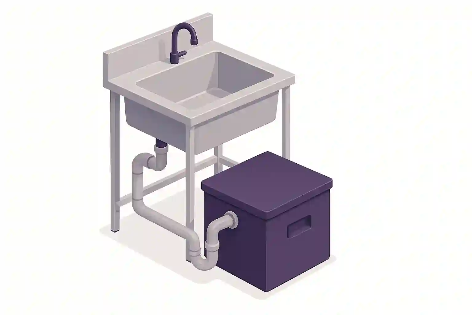 Le bac est installe sous evier, entre le siphon de la plonge et le reseau d'evacuation. La mise en place est donnee comme realisable en 2 a 3 h en configuration standard, sans raccordement electrique, ce qui facilite l'integration en sites occupes et limite les travaux.